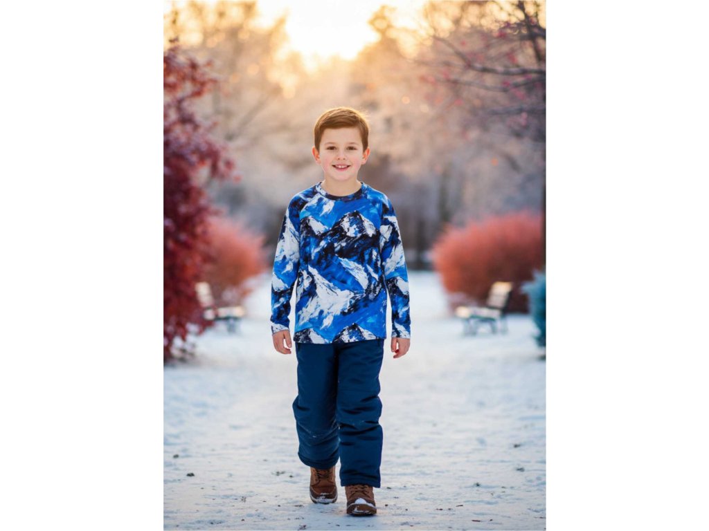Motív zaujme živou grafickou potlačou zasnežených štítov a tmavých ihličnanov.
